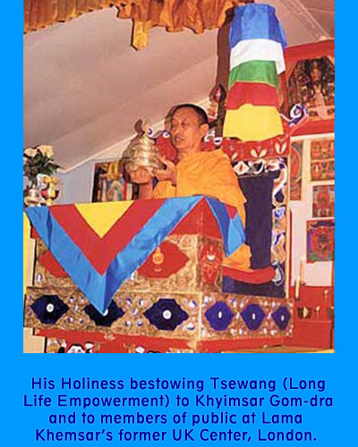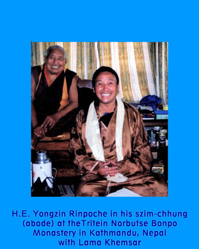 Lama Khyimsar Rinpoche is a Bön Buddhist Master. He is the founder and spiritual director of the Tibetan Yung Drung Bön Study Centre, UK, The Tibetan Yungdrung Bön Institute, Miami, FL, USA, Kunzhi-Ling, Switzerland and Kunzhi Ling Italy.